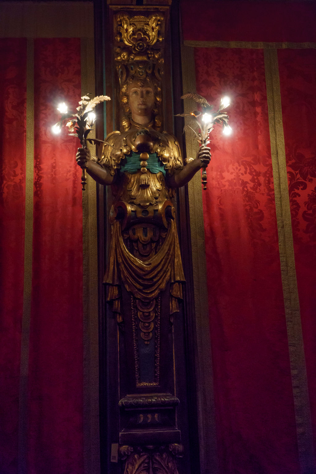 | Pew seats from Italian and Spanish churches, line the Assembly Room. |